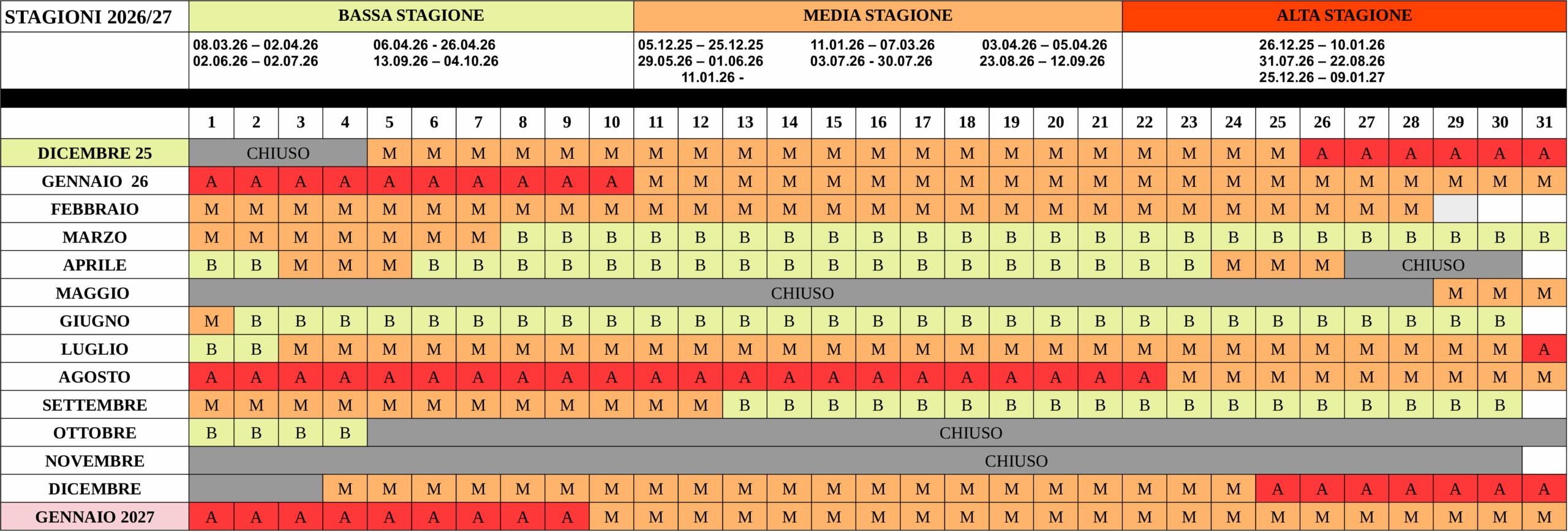 | LISTINO 11.01.2026 – 31,12,2026 CLOSURES 26/04/2026 h 20:00 - 29/05/2026 h 9:00 04/10/2026 h 20:00 – 04/12/2026 h 9:00 | LOW SEASON 08.03.26 – 02.04.26 06.04.26 - 23.04.26 02.06.26 – 02.07.26 13.09.26 – 04.10.26 | MID SEASON 11.01.26 – 07.03.26 03.04.26 – 05.04.26 24.04.26 – 26.04.26 29.05.26 – 01.06.26 03.07.26 - 30.07.26 23.08.26 – 12.09.26 04.12.26 – 24.12.26 | HIGH SEASON 31.07.26 – 22.08.26 25.12.26 – 09.01.27 |